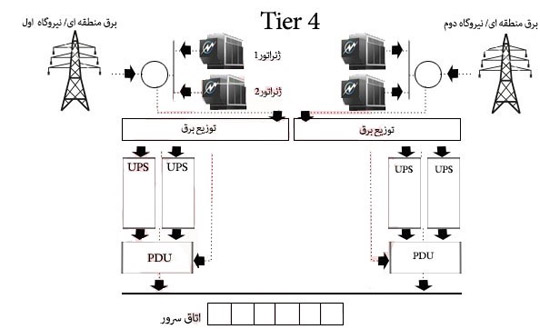 تفاوت عمده قسمت تأمین برق این سطح با سطح Tire3 در وجود دو عدد ژنراتور پشتیبان در خط دوم میباشد که در این خط توزیع UPS2 هم افزوده شده است.